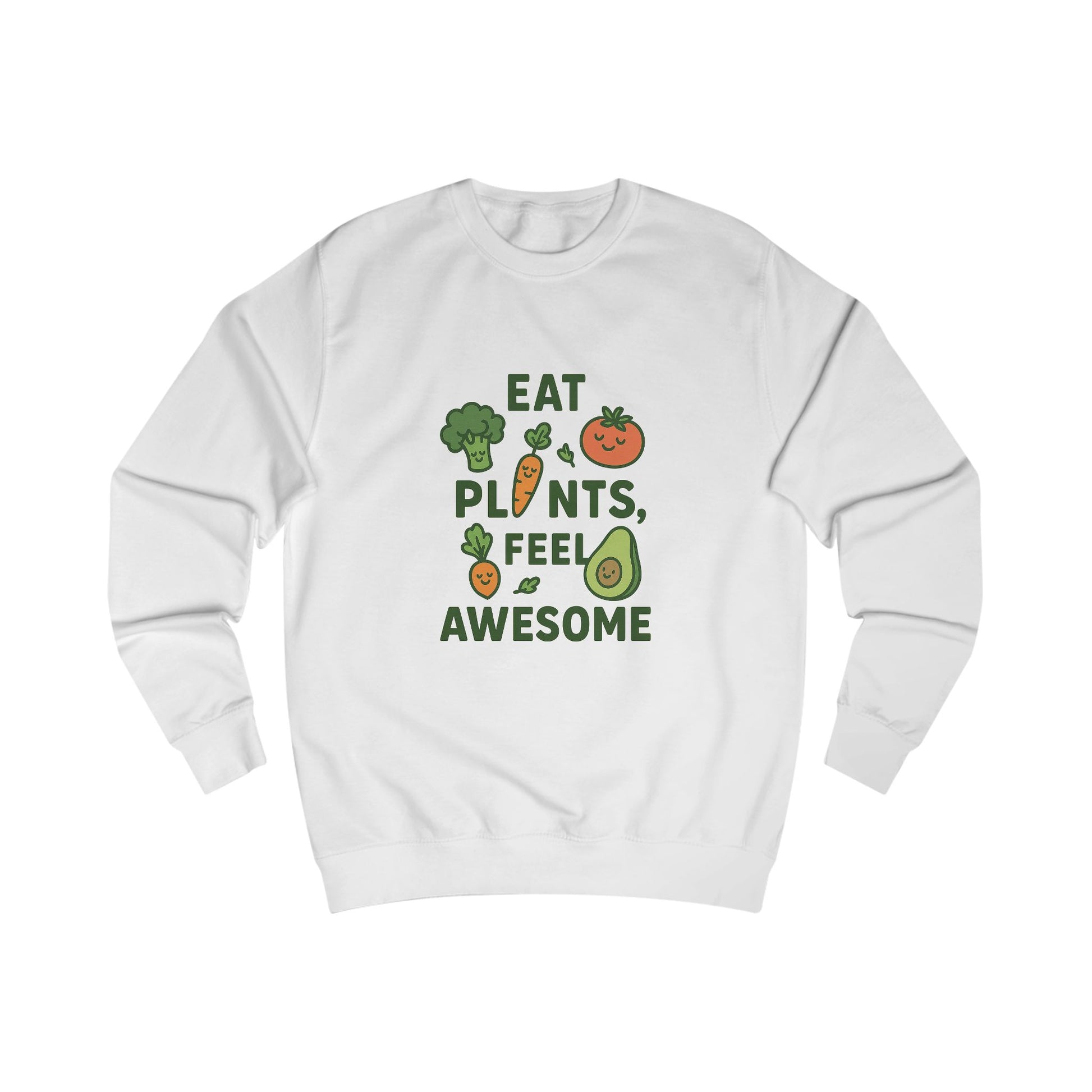 A cozy unisex sweatshirt featuring playful typography that reads 'Eat Plants, Feel Awesome' with cute illustrated vegetables. This sweatshirt exudes a fun and positive vibe, perfect for anyone who loves vegetables, healthy eating, and a playful style. Ideal for vegans, vegetarians, health enthusiasts, and anyone looking to add some whimsy to their wardrobe. Great for Earth Day, Veganism celebrations, and everyday wear.