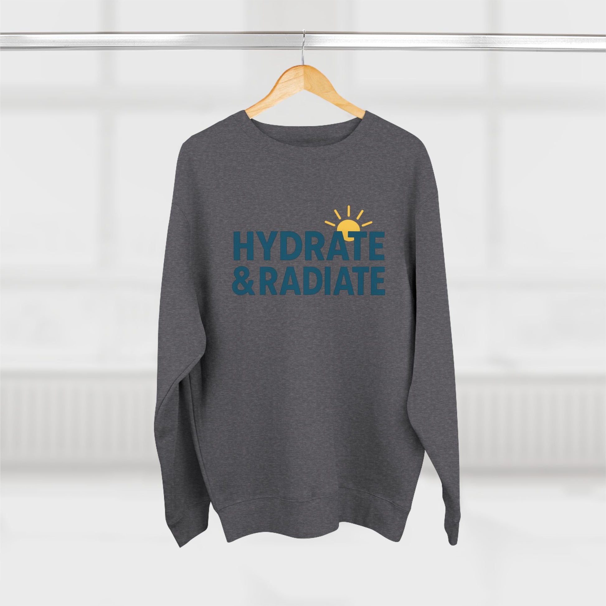 Stay cozy and stylish with this Unisex Crewneck Sweatshirt featuring a 'Hydrate & Radiate' design with a droplet and sun icon blended into bold modern lettering. Perfect for those who love a casual yet trendy look, this sweatshirt is great for everyday wear or as a comfortable loungewear option. Ideal for those who enjoy celebrating self-care practices and staying positive