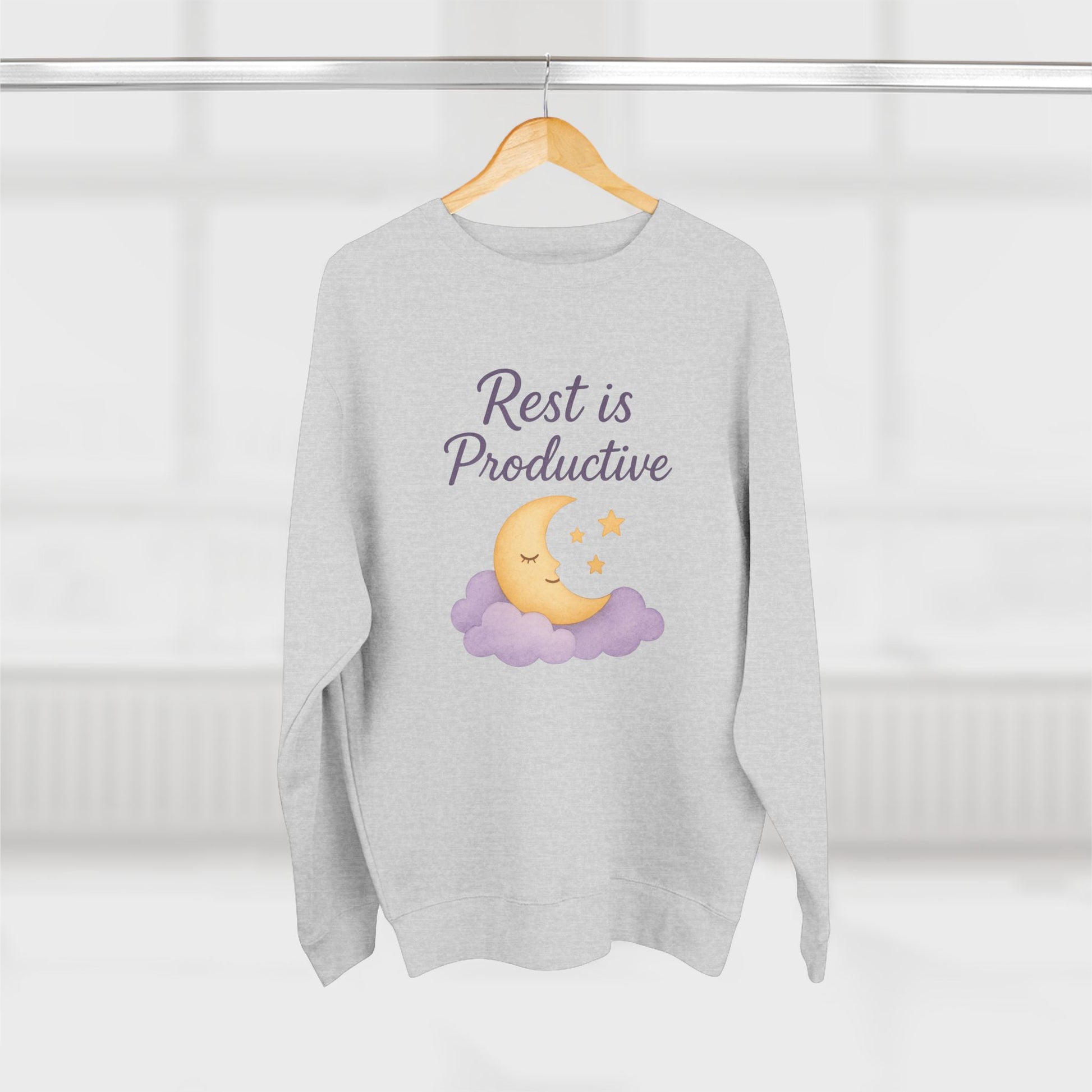 This cozy unisex crewneck sweatshirt combines comfort with a delightful design, perfect for snuggling on lazy days or layering for a casual outing. The charming graphic featuring a moon and clouds accompanied by the phrase 'Rest is Productive' encourages a positive mindset, making it an ideal addition to your loungewear collection. Its medium-heavy fabric provides warmth without being bulky, making it suitable for any season. This sweatshirt is perfect for all genders and ages, appealing to anyone who values relaxation and self-care. Celebrate moments of rest during holidays, cozy days at home, or simply to remind yourself to take it easy.